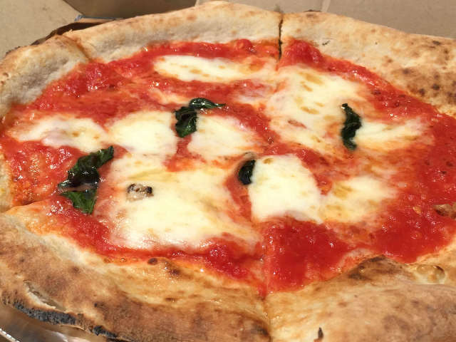 店に入ってすぐ目に飛び込んでくるのは、楢(なら)の木を使用した大きな薪窯。400℃以上に温度を上げた薪窯で一気に焼き上げられたピッツァを5分と待たずにテイクアウト可能。マルゲリータの生地は薄く、外はカリッ、中はもっちりとしていて耳まで美味しくいただける。そしてフレッシュなトマトソースの酸味と、とろけるモッツァレラチーズのコク、バジルの爽やかさがバランスよく口の中で合わさり、シンプルながらも深い味わいに魅了されてしまう。また、冷めても固くならず、温めなおして食べても◎。たまには、平日に窯焼きの本格ピッツァをテイクアウトして食べるのも贅沢では。直径28センチだが、薄い生地と軽いトマトソースのおかげで女性ひとりでもペロリと食べ切れてしまう。そしてなんといっても、ランチはマルゲリータが、1,000円(税込)というコスパも見逃せない。