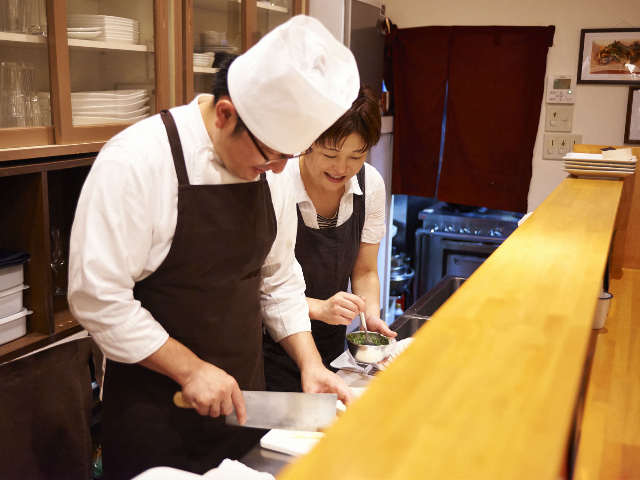 合わせるお酒のラインナップは、ワインが優勢。ビール(ヱビス生)や紹興酒のボトルもあるけれど、力を入れているのはワインです。夫婦ふたりで選んだリストには、ひとつずつに愛のあるひとこと解説が添えてある。自然派の銘柄も織り交ぜつつ、全体的に穏やかな味わいのセレクション、という印象。そしてそれは五十嵐さんご夫妻の印象に通じるところでもあり。口数は少なく、お客さんにあれこれと話しかけるタイプでは決してない。けれど、こちらの様子をきちんと見ていて、的確なタイミングで取り皿を出してくれたり、飲み物を尋ねてくれたり。そういうぐあいに、客をもてなしたいという気持ちがはしばしから伝わってくるから、言葉はなくとも居心地がいい。