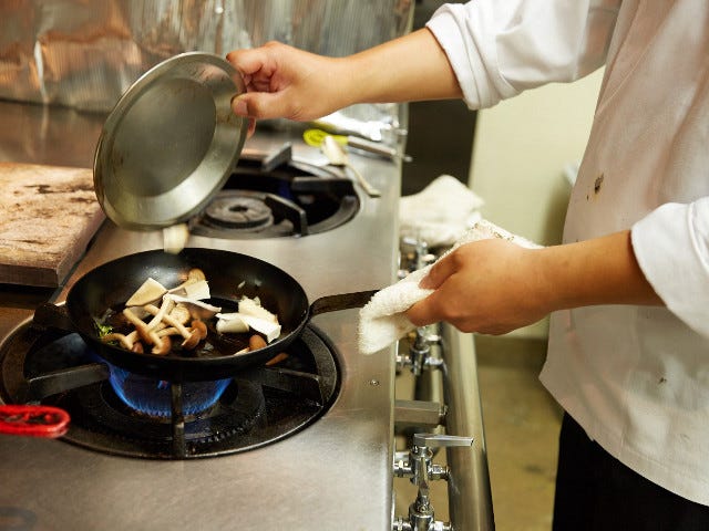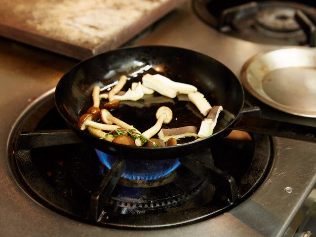 6.油に香りが移ったらキノコ2種類を入れ、塩で味を整える。(素材の味を際立たせるため、味付けは塩のみで。)