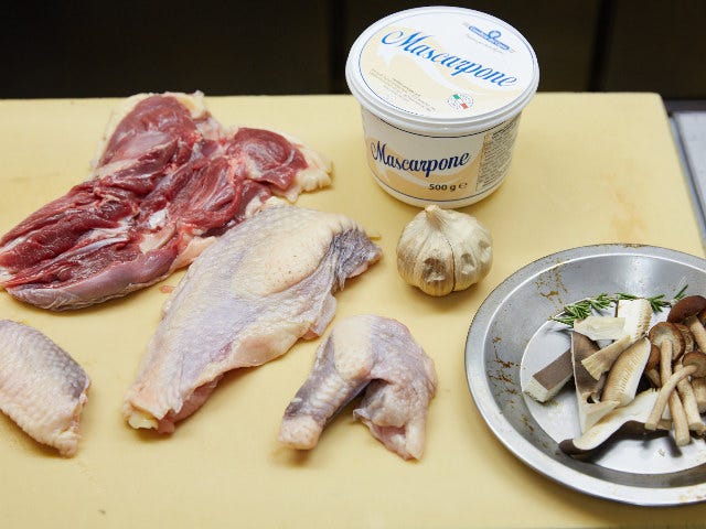 1.ホロホロ鳥は、モモ、ムネ、ササミの各部位にさばいて分けておく。