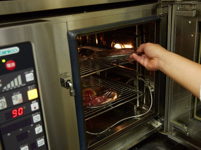 3.ホロホロ鳥は各部位ごとにバット等に入れ、ラップをし、90℃に温めたスチームオーブンに入れる。加熱時間は、モモ30分、ムネ20分、ササミ7分。