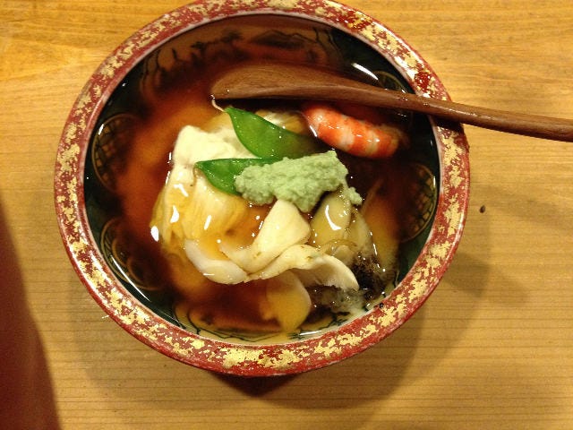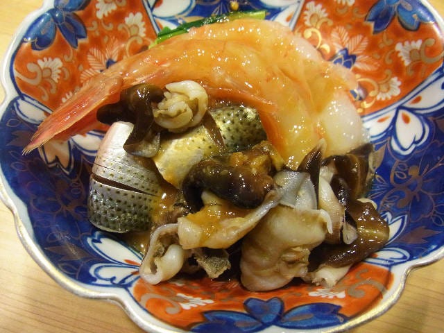 食べると、烏賊ではなく蚫の肝で作られた塩辛だった。「みそ汁」には、小ぶりながら伊勢海老が1本丸ごと入っていた。