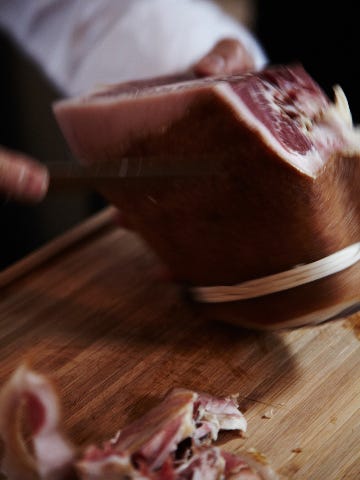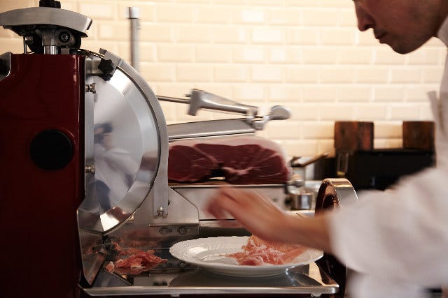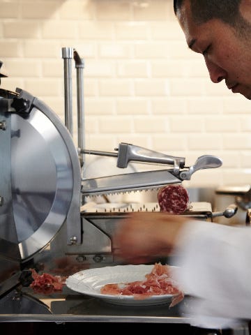 たとえば生ハム。前店でもイタリア製の美しい手動スライサーを使っていたが、円形の刃の直径が30cmから37cmへ、より大きなものに買い替えた。刺身包丁と同じ原理で、刃渡りが長い分ゆっくり長く切れ、繊維を壊さないのだとか。