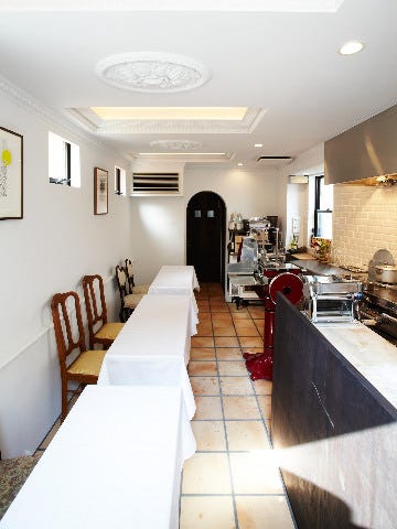 キッチンの中に客席を作ったような小さな店は、全員が並んでシェフのほうを向くライブ仕様。でもカウンターでなく、テーブルにきちんとクロスを引いたリストランテである。