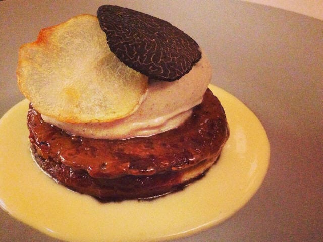 供される料理は、単にイタリアの食材とか技法を使うというのではなく、スピリットが体現できているもの。いろんな食材同士、あるいは一般に「アグロドルチェ」と呼ばれる甘いものと塩分をぶつけあうというスタイルだ。