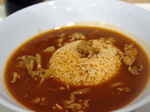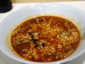 ハヤシライスのようでもあるが、粘度が少なく、ハヤシ茶漬けかスープハヤシといってもいいほど、じゃぶじゃぶである.