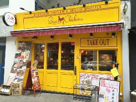 恵比寿駅東口の通り沿いの、ひときわ目立つ黄色いお店が、ロティサリーチキンで有名な「クイーン オブ チキンズ」。店先には専用の大きな回転式ロティサリーオーブンがあり、鶏を丸ごとローストしている様子が外からもよく見える。