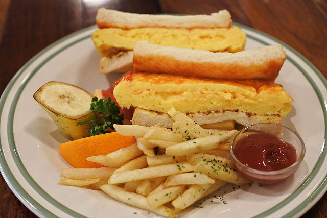 厚焼きたまごサンド750円、カツサンド850円、白身フライサンド850円、チキン南蛮サンド850円、ハムサンド750円、ツナポテトサンド750円、ナポリタン750円、メロンクリームソーダ650円(価格はすべて税込)