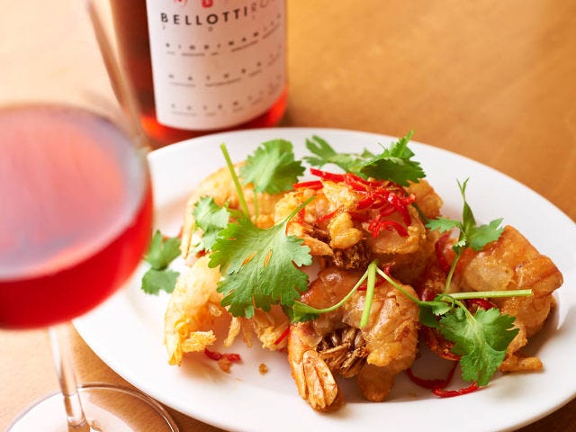 つまみには、メニューの主軸である焼き物ヴァリエーションのなかから、勝山さんのおすすめを伺いつつ、自家製腸詰、皮付き豚バラ肉のクリスピー、炭火釜焼きアヒル、炭火釜焼きチャーシューをチョイス。“お肉もいいけど野菜もね”な気持ちでアスパラガスの上湯がけと、「これはうまいよ!」という鶴の一声で即決した海老の香味揚げも。ワインももちろん、勝山さんに進められるまま注がれるまま。