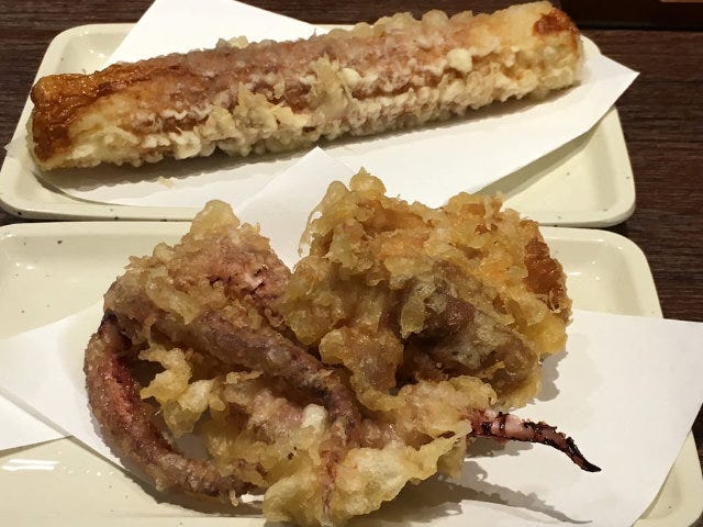 天ぷら「ちくわ」200円、「ゲソ」180円、「とり」200円、「半熟卵」100円