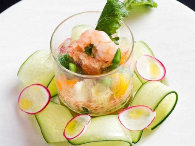 ラ・ロシェルの定番料理「魚介類のテリーヌ 季節の野菜と共に…」を家庭用にアレンジしたのがこのレシピ。「カクテルサラダ」と聞くとなんとなく難しそうなイメージを持つ方も多いかもしれないが、特別な材料や難しいテクニックは一切不要。テリーヌ型をグラスで代用することで、お手軽且つ見栄えも良い一品に仕上がっている。グラスの周りにスライスしたキュウリやラディッシュを添えることで、さらに華やかな印象に。