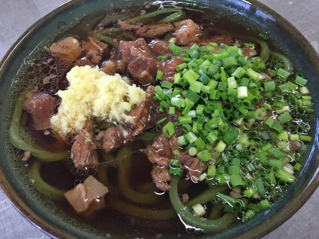 松:何軒も回ったことがあるわけではないですが、おそらくいちばんスタンダードな味は、モノレール北方駅近くの「今浪うどん」ですね。住宅地の入口の比較的見つけやすい場所にあります。肉もあまり筋っぽい部分、軟骨部分は入っておらず、臭みもあまりないのでおろし生姜を入れなくても美味しく食べられます。