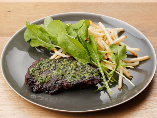 メイン料理となるローストビーフは、セージやタイム、パセリなど細かく刻んだハーブを揉み込んでからオーブンで焼き、それにバジルやニンニク、オリーブオイルで和えた鮮やかな緑色のソースがたっぷり。一口食べると、絶妙な火入れ加減で肉の旨味をダイレクトに感じられる。その後にハーブの爽やかさが広がり、軽やかで刺激的なローストビーフに仕上がっている。北海道産のジャガイモを使った、付け合わせのパルメザンポテトも美味。