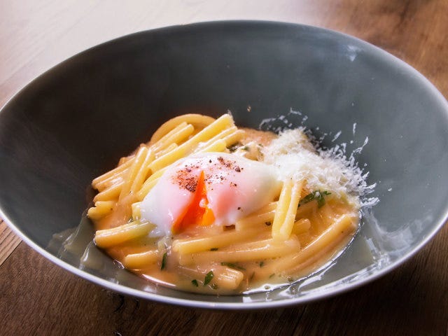 Macaroni, onsen tamago, crispy pancetta, cracked pepper