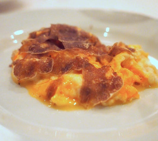 「オストゥ」ではこれまで、目玉焼き、スクランブルエッグ、タヤリンと言われる卵黄たっぷりのパスタ、フォンドゥータチーズを詰めたラビオリ、パルミジャーノのシンプルなリゾットなどでいただいたことがある。