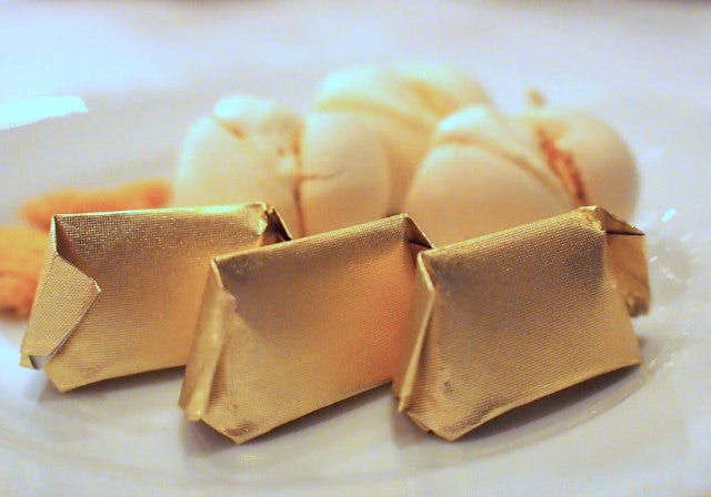 「オストゥ」ではこれを手作りしていて、やわらかさと香りが断然違う。でも、その前に金色の包装をほどくのがもったいないほどの美しい折り方を眺めて欲しい。シェフの妻、美苗さんの作で、夫妻の清潔感が伝わってくるから。
