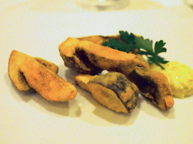 パン粉にセモリナ粉を混ぜた細かい衣で揚げるポルチーニのフリットは、衣の「カリッ」と、茸の「トロッ」が病みつきの食感。必ず小声でそっと「おかわり」と言ってみてしまう(しないけど)。