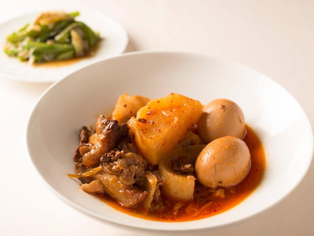 日本最大級の料理人コンペティションRED U-35の審査員でもあり、リストランテ「ポンテベッキオ」を含むイタリア料理店4店舗を大阪に構えるオーナーシェフの山根大助シェフにご紹介頂いたのは、「牛すじ肉と大根・煮卵のキムチおでん」。山根シェフが初めて大阪の本町にお店を出した1986年から、約29年間作り続けられている伝統のまかない料理だ。