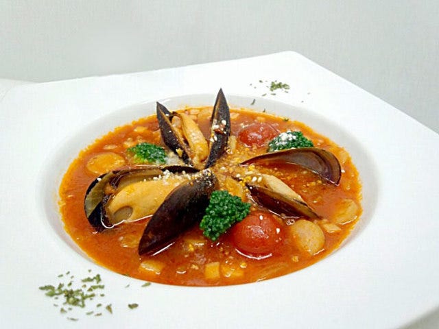 ム一ル貝と野菜のミネストローネ風スープリゾット