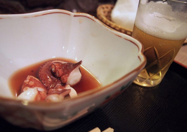 座ると夏などは茹でたての温かい小ダコが小鉢で出てくる。