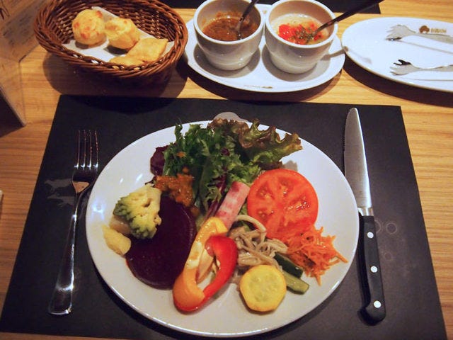 ディナーは、まず約50種類以上の野菜とデリが並ぶサラダバーでお皿に好きなものを好きなだけ盛れるバイキングから始まる。ブラジル名物のパルミット(ヤシの新芽のボイル)、ロマネスコ、ビーツといった、なかなかお目にかかれない珍しい野菜やデリも並んでいるから、ぜひ味わってみてほしい。