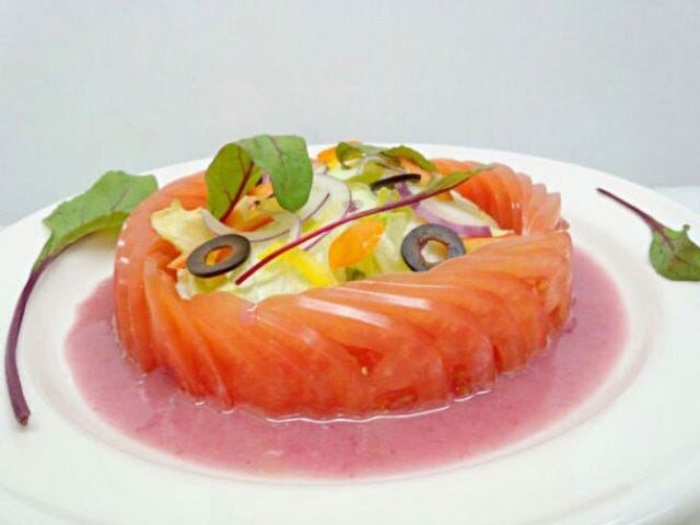 山形県「Bistro&Bar Robinson」の嶋倉秀一シェフから教えていただいたのは、スイーツのような見た目に歓声が上がりそうな「トマトの宝石サラダ仕立て ピンクのドレッシングで」。