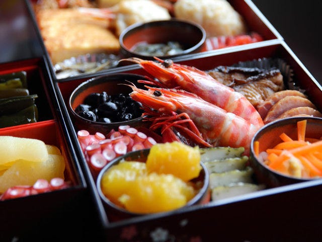 「おせち」料理はもともと、新年を祝う武家料理や、庶民の正月料理が混ざり合って少しずつ形態が完成されていったもので、「めでたさを重ねる」という意味からお重に入れられるようになったと言われている。また、正月三が日までは家族で正月休みを満喫出来るように、と保存のきく料理が多い。