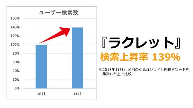 10月に比べて『ラクレット』の検索数が急上昇した理由のひとつとして、11月11日が「チーズの日」だったことが挙げられる。このチーズの日にちなみ、東京・恵比寿では「チーズフェスタ2015」というイベントが開催され、ラクレットを含めたさまざまなチーズの食べ方について紹介され、SNSでもイベントの様子が拡散されたようだ。