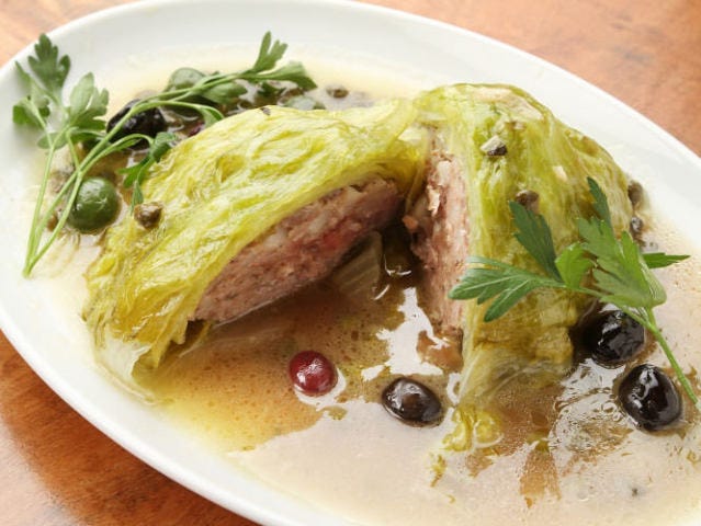 煮込み料理といっても、今回ご紹介するのはレタスの芯をくりぬき、そこにサルシッチャを詰めて焼くという大胆なレシピ。ロールキャベツをイメージする人も多いと思うが、レタスならではの柔らかさの中に残るシャキッとした食感と、サルシッチャの風味豊かな味わいの組み合わせがとても新鮮な一品。