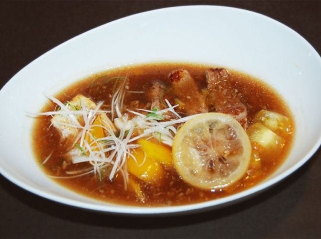 スープはコンソメベースに赤ワインとポルチーニエキス、バルサミコ酢を合わせて風味豊かに。主張の強い調味料同士であるが、これが不思議とマッチするのでぜひお試しを。
