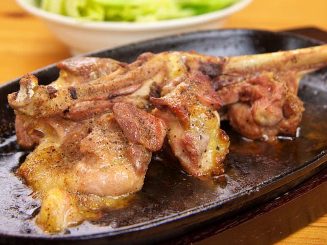 その雄々しい姿は、まるで和製ローストチキンといったところだろうか。鶏の骨付きもも肉をニンニクの効いたスパイスで味付けし、オーブン釜などでじっくりと丁寧に焼き上げているため、表面はカリッと、なかはジューシーに。