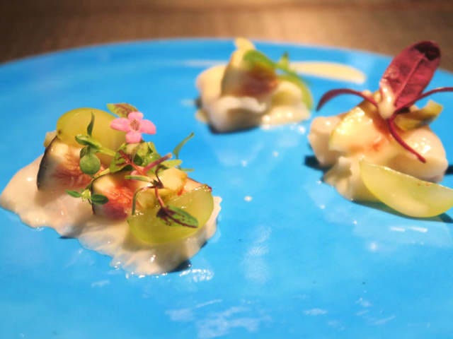 一番のこだわりであるチョウザメは、店名の由来ともなった静岡県浜松市春野町(はるのちょう)の良質な水の中で、稚魚から育てられているという貴重な食材。心地よい弾力とほのかな甘みが、いちじくなどのフルーツと寄り添い、ねっとりとした旨みで口内を支配していく。チョウザメ料理のイメージに合わせて作られたという、特注の色鮮やかなライトブルーのプレートは、国内外の星付きシェフたちも愛用する、佐賀県カマチ陶舗の有田焼の器だ。透き通るほどに白く輝くチョウザメ肉の美しさを、見事なコントラストによって引き立たせている。