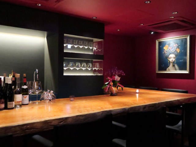 店名のもう一つの由来は、フランス・ブルゴーニュワインに代表される葡萄品種「ピノノワール」。チョウザメの育つ「春野町」と「ピノノワール」を合わせて「ハル×ピノ」というわけだ。ピノノワールを主体とするブルゴーニュワインがワインリストのなんと8割を占めるという。ディナーを終えた深夜のバータイムには、どっしりと広く構えたバーカウンターにて、生ハムやオリーヴとともにワインバー利用もいいだろう。深く濃い赤と黒に塗られた壁には、大きく見開いた瞳で見つめる女性の絵画が圧倒的な存在感をもって飾られていて、より一層店全体が大人の色気をまとうのだ。