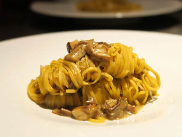 名だたるホテルレストランを中心にイタリアとフランスの料理を学び、ローマの三ツ星レストランでも修業を積んだまさにスターシェフ。その彼が新境地として選んだのは、生産者と共に育む「通いたくなる」レストラン。お店のオープンにあたり、最高の食材を求めて全国各地の生産者を巡ったという。「生産者が見える食材」がテーマとなったシェフのおまかせコース(11,000円)では、自社養殖のチョウザメを使用した前菜はもちろん、ポルチーニとゴボウのだしが滋味深い自家製パスタのタリオリーニ、宮崎県産尾崎牛40日熟成の炭火焼がもたらす体温でとろける肉の官能的な味わいなど、シェフの渾身の逸品たちを満喫できる。