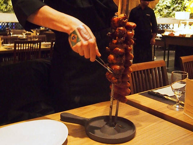肉汁滴る串刺し肉をゲストの目の前で切り分けてくれるエンターテイメント性にも注目!