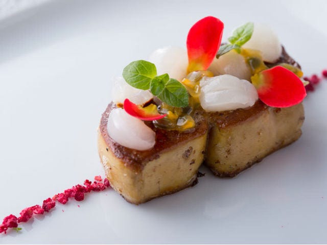 今回、フィリップシェフが選んだのは世界中のトップパティシエから愛されているヴァローナ社のチョコレート。原産地と種類にこだわったカカオを、昔ながらの製法と職人技で作るチョコレートは風味も味も別格。それぞれのチョコレートの個性を最大限に生かしたバレンタインにぴったりのメニュー。前菜はフォワグラ。ローストナッツを感じさせるビターチョコレートの「カライブ」を忍ばせて、軽く焼き色をつければ、ほんのりとした甘さと香りが食欲を刺激してくれます。エディブルフラワーやパッションフルーツが色鮮やかで美しい一皿。
