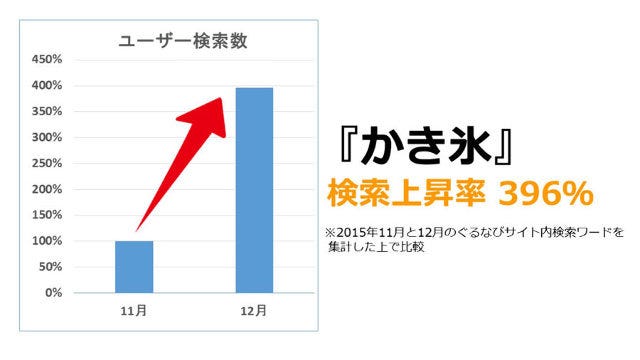 夏の風物詩であるかき氷は、当然夏に食べるものというイメージが根強いが、かき氷を通年で味わう人が近年増加中。ブームは衰えることなく進行し続け、今年の記録的な暖冬傾向でさらに拍車をかけた。結果、「ぐるなび」で『かき氷』が検索された回数は、12月にも関わらず前月比でなんと396%も急上昇した。忘年会など、外食が多くなるこの時期、飲み会後のデザートとしてのニーズも高まった結果だろう。