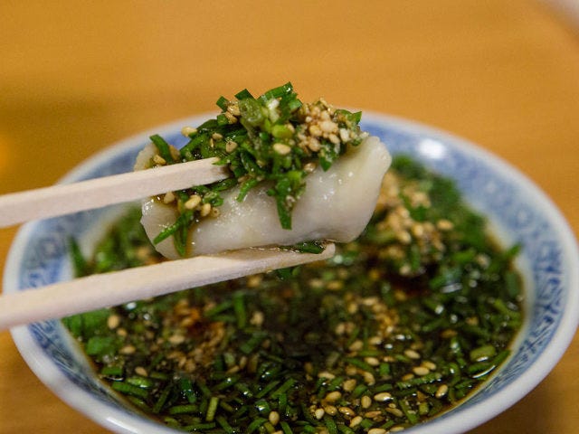 一般的な醤油ベースのタレに、なんと刻んだ生ニラとゴマをたっぷり入れる。餃子のひだの部分に生ニラとゴマをたっぷり乗せていただくのが“娘娘”流だ。