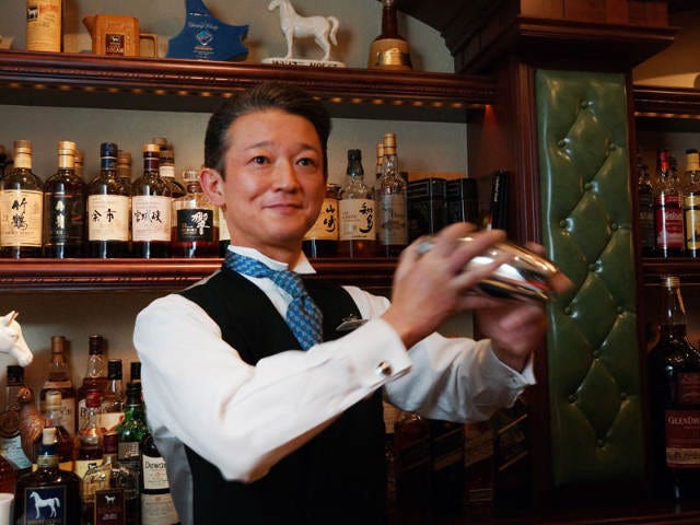 カウンターの向こうで静かな笑顔でこちらを迎えてくれるのはオーナーバーテンダーの勝亦誠氏だ。きれいに撫でつけられたシルバーグレイの髪、きりっと伸びた背筋。俳優と言っても通じるような端正な顔立ち。これはただ者ではない。ちょっと自分には不相応ではないかと、きびすを返したくなるのをこらえて、重厚なカウンターの席に腰を下ろす。映画の世界に入り込んだような印象だ。気分はジェームズ・ボンド。ウオッカマティーニをとの言葉が出かかるが、初めての店では安心できない。まずは様子を見よう。