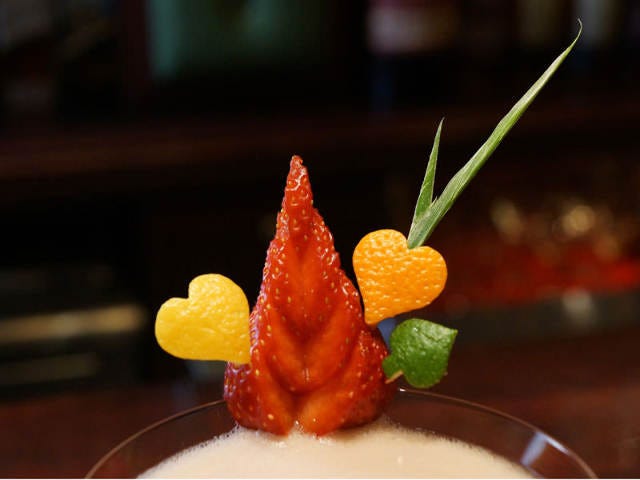 ストイックな印象の勝亦氏が差し出したショートグラスには、ブレンダーから赤褐色のシャーベット状のものが注がれ、そこにシャンパンを満たして完成となる。デコレーションもイチゴを中心に、果物の皮で作ったハートとスペードが突き刺さっている。渋いイメージの勝亦氏から、こんなかわいいものが出てくるとは驚きだ。