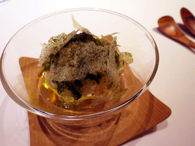(炙った水ダコ、フェンネルのムース、青海苔のジュレ&チップス)