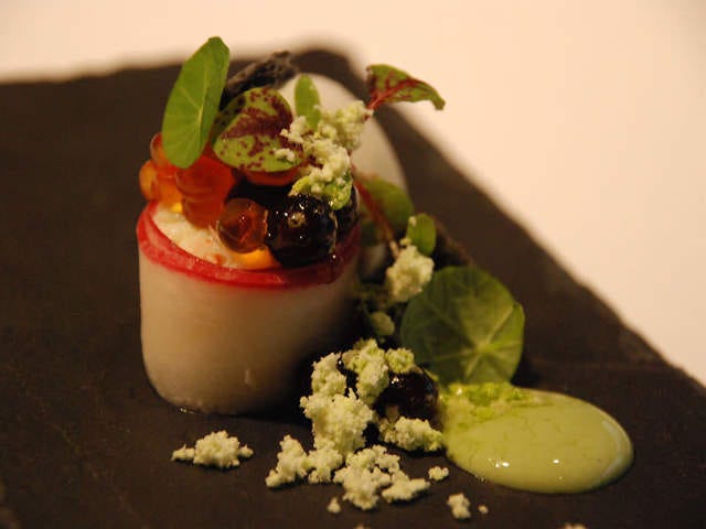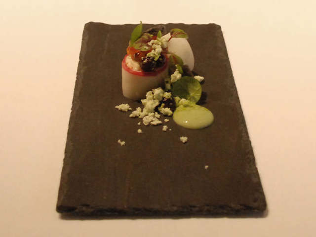 (北海道のズワイガニを薄くスライスした大根で包んだもの、タピオカ、イクラ、炭のチュイル、ハーブのオイルパウダー、オゼイユ)