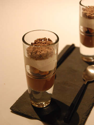 (チョコレートのプリン、ナッツ、板状のチョコレート、マスカルポーネのムース)