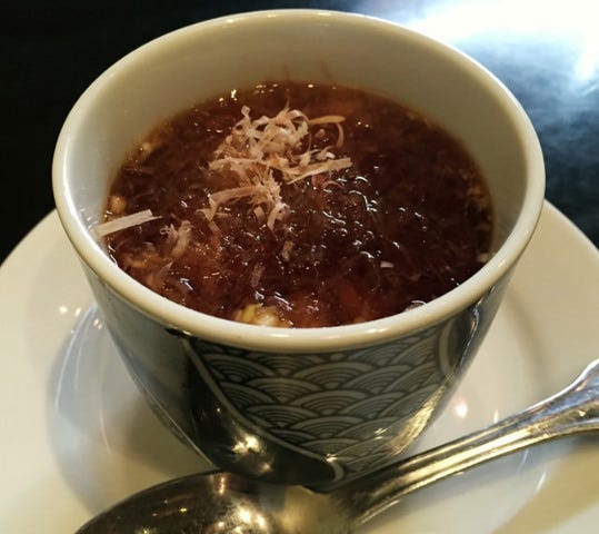 ラーメン以外では、自家製の豆腐が人気。醤油味のつゆに冷奴が浸っているような1品で、おろし生姜、刻みネギ、鰹節がトッピングされている。これも、とっても美味しい。