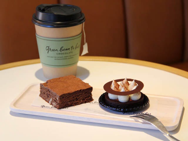 そのほかショーウィンドウには、チョコレートタルトなど、デザイン性の高い生ケーキやブラウニーなどの焼き菓子が並ぶ。全商品テイクアウトOKだが、併設のカフェでドリンクと供に味わうことも。ドリンクもカカオティやホットチョコレートなど、ビーン・トゥ・バー専門店ならではのラインナップ。さらにチョコレートに合わせてセレクトしたワインなどのアルコール類も楽しめるので、大人のデートにも使えそう。