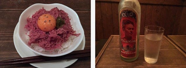 酸っぱ辛いコーンは、青く爽やかな熟成なしのブランコにも、1年未満の樽熟成を経たレポサドにも相性抜群。他にも、実山椒トーストや鮭のポテサラなど誘惑が多い。そんな中、最近人気の〆は禁断のTKG。千駄木の名店腰塚のコンビーフに生食用の黄身とトリュフソルト、ハラペーニョ、燻製醤油を垂らして食べる。氷なしのテキーラハイボールと、まさに悪魔の相性だ。