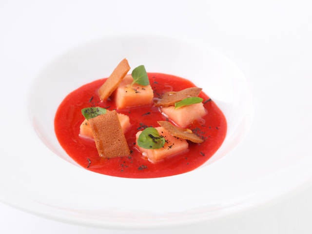 まず始めは、春を感じる「いちごとトマトの冷製スープ」から。色味からトマトのスープかと思いきや、逆にいちごでした。博多の「あまおう」だけを使ってスープに仕立て、トマトのソルベとラングドシャとともにいただきます。