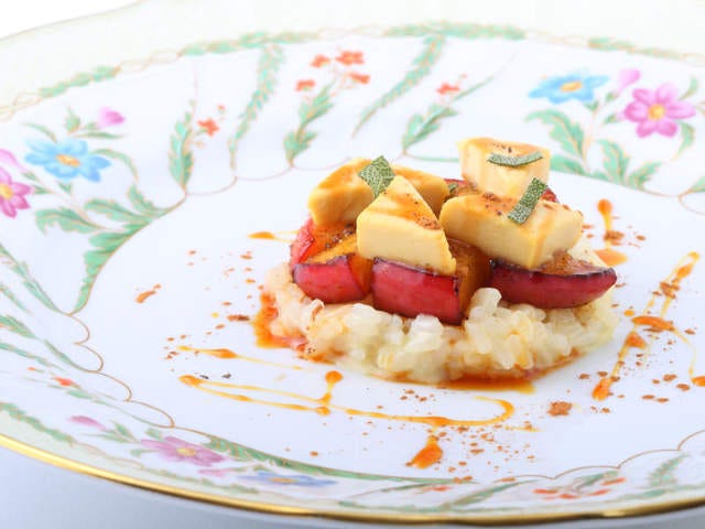 そして他にも前菜として「マチェドニア」や「人参のピューレとコーヒーのアイスキューブ オレンジジャムのパイ」があり、次はパスタの「リオレ」へ。米のミルク煮、つまりリゾットにリンゴのソテー、フォワグラのプリンを乗せてカラメルソースをとろり。