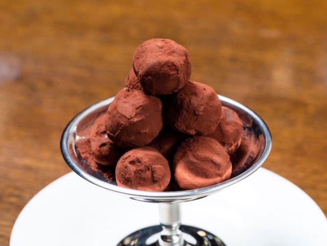 あとは、丸めておいたガナッシュ(生クリームとチョコレートを溶かしたもの)にテンパリング後のチョコレートをコーティングして、カカオパウダーをまぶすだけで出来上がり。口の中で溶け出すチョコレートの香りを存分に味わって。