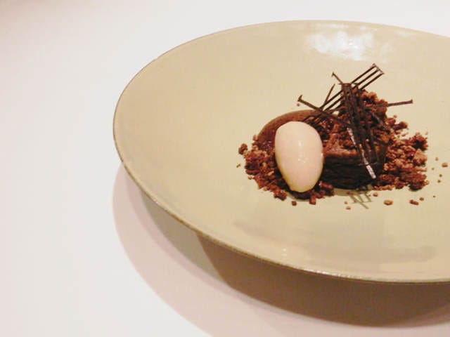 さぁ! いよいよやってきました! メインとなるチョコレート。メインだけあって流石の風格。サクサクしたカカオのパイが、クリームとムースの2層になったビターチョコレートの上に鎮座する大人な雰囲気満載ですな。食べてみると確かに濃いのだが、なぜかヘビーではない。サブレやパイ生地が軽いせいだろうか。と、そこにおやっ? 何か塩気を感じる。これは…黒オリーブだ! この細かく切ったオリーブがものすごい名脇役なのです。ビターチョコの苦味や甘さにキラリと光る塩気の存在。う〜ん、美味だ。さらに黒豆のアイスクリームも苦味を緩和してくれる。いやはや、完璧なマリアージュ。油脂分がしっかりあるので、お腹もふくれて大満足。最後にバターのみのシンプルな焼きたてのクレープで宴が終了する。